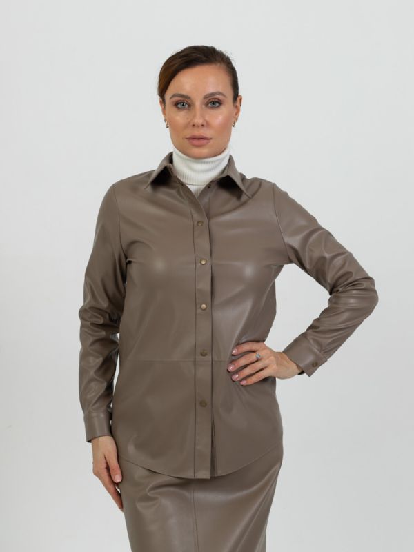 Eco-leather shirt is a stylish solution for every day. This model has a straight silhouette with long sleeves, the clasp is located in the front along the middle seam on the buttons. Unpretentious in care, it is perfect for working in the office, and for long walks, can be combined with trousers, skirts, shorts.