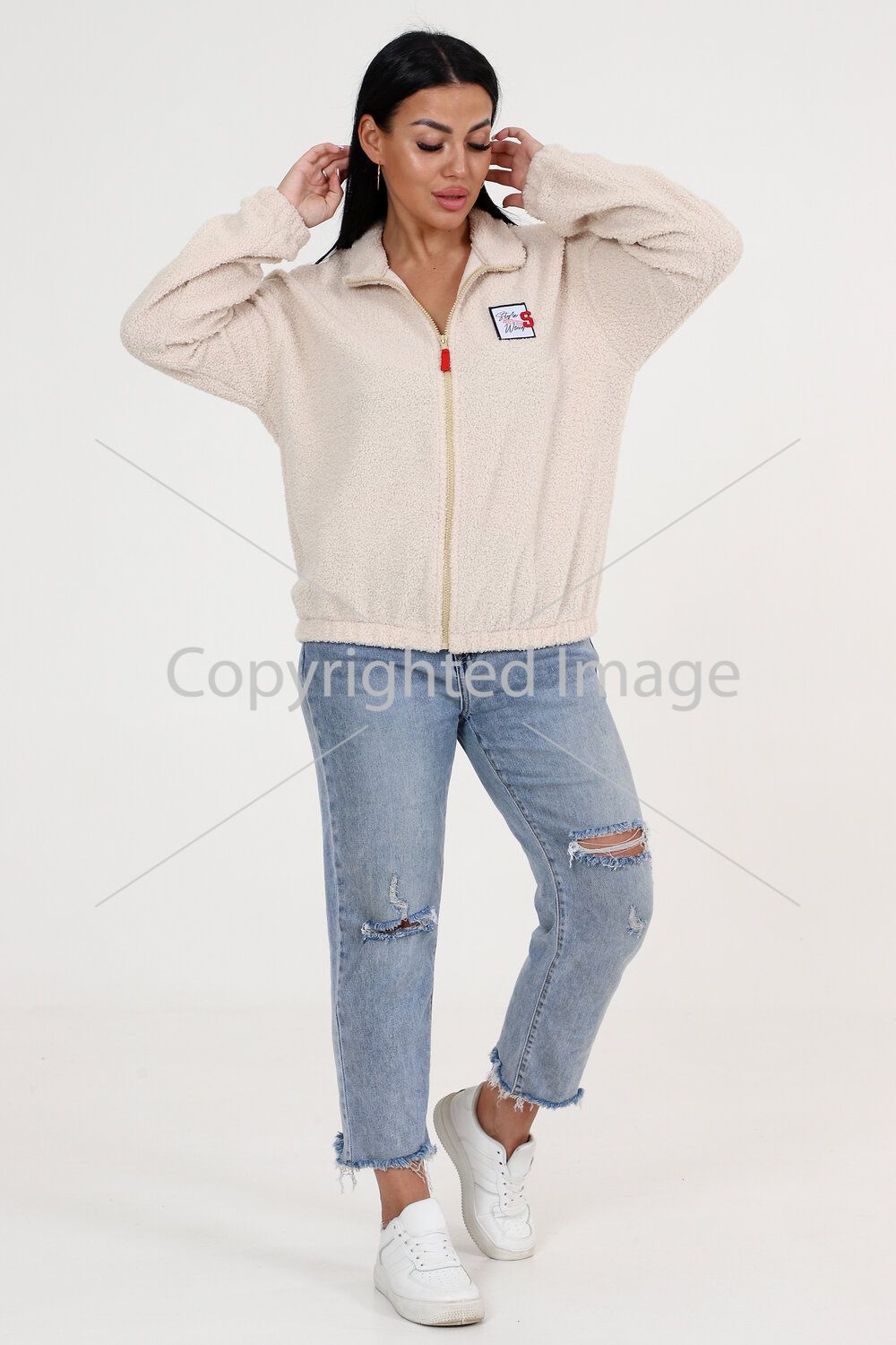 Boucle women's sweatshirt. Sweatshirt with a stand-up collar, with a set-in sleeve, with a zipper closure. There's a patch on the shelf.