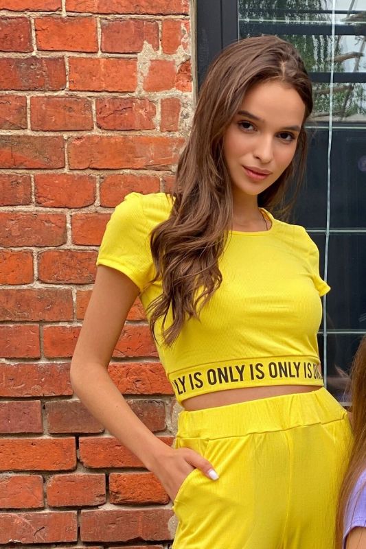 T-shirt form-fitting, with a rounded neck, length above the waist. Set-in sleeve, short. The neck is treated with a label made of the main cloth.