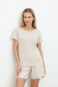Set for comfortable sleep made of natural cotton. The standard length T-shirt is finished with elastic lace. Shorts with a soft elastic waistband sit comfortably on the figure.