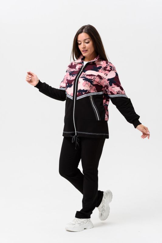 Women's suit jacket and trousers. Straight silhouette jacket with a set-in sleeve on a kashkorse cuff. Zipper closure. The upper parts of the jacket and the upper parts of the sleeves are made of printed fabric with a space print. Stand-up collar. The lower part of the shelf and back made of plain fabric is tightened with a cord. There are zippered pockets on the shelf. Trousers are straight, slightly narrowed to the bottom
